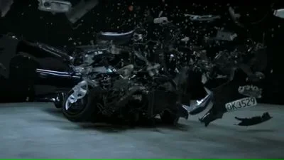 To demonstrate the destructive energy generated by a car crash, we took a car and blew it apart with dynamite.